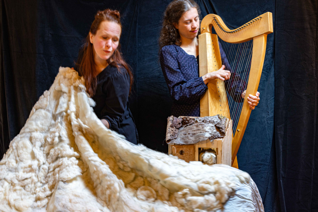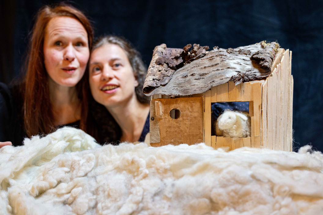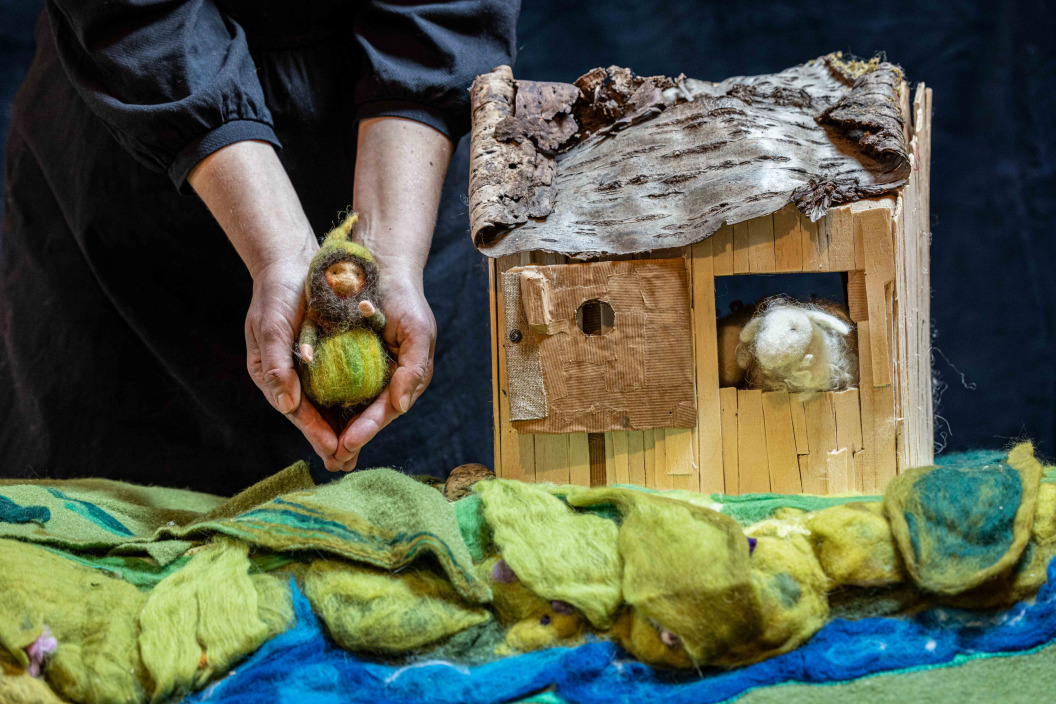 Petite histoire racontée sur table avec personnages en laine feutrée.